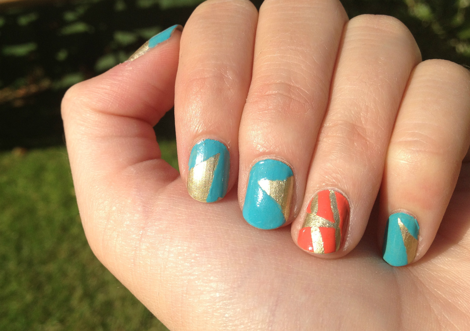 Working one nail at a time, apply your chosen colour(s) over your masking taped nails. I used Rimmel London Lycra Pro in 440 Orange Bliss, and 17 Fast Finish in Catwalk Coture. Apply a layer of paint that's thin enough so that it isn't all gloopy, but thick enough so that it won't need another coat. Wait five seconds, then gently (and carefully!) peel off the masking tape. By peeling off the tape while the paint is still wet, it gives you smoother, cleaner edges and a neater finish.